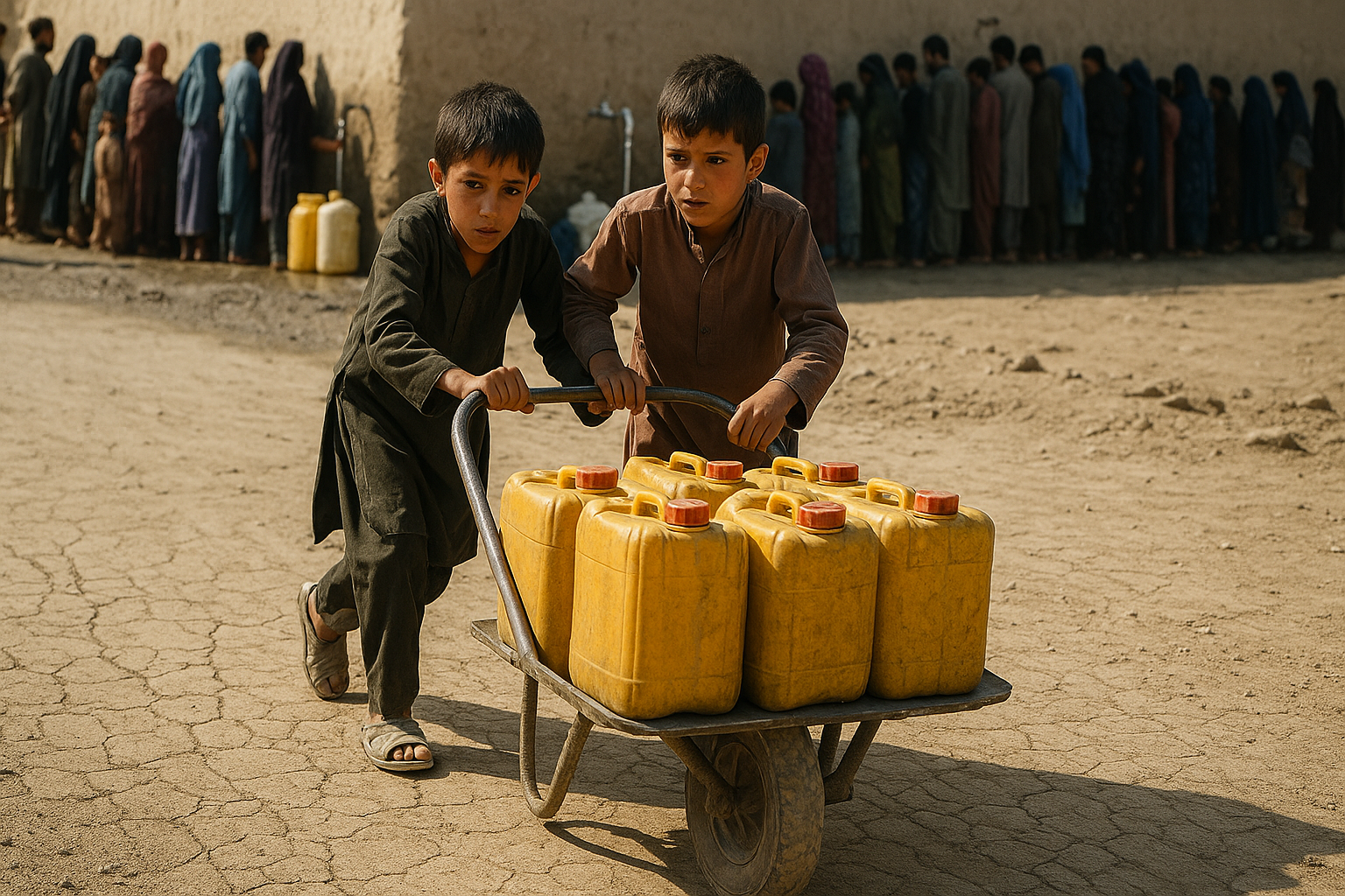 Eight-year-old twins Noorullah and Sanaullah should be in school. Instead, they spend their days pushing a wheelbarrow filled with empty jerrycans through Kabul’s dusty alleys, waiting hours at communal taps to collect water.